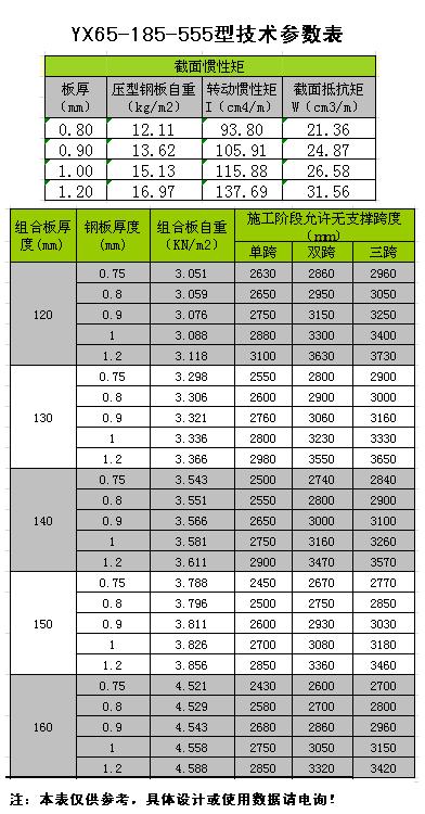 技术参数:波高65mm,波距为185mm,有效覆盖面积555mm,它采用的是1070mm的热镀锌钢板冷压成型的,承载力较强,防火性能较好,它的生产工艺和验收流程严格按GB/T12755-2008国家压型钢板要求执行。所用的材料一般都选用首钢,邯钢,唐钢,鞍钢,宝钢,武钢等国内大型钢铁生产企业生产的优质碳素结构钢或是低合金钢,钢材品质绝对满足GB/T2518-2008国家镀锌板标准, 厚度一般用0.75mm、0.8mm、0.91mm、1.0mm、1.2mm、1.5mm基板,镀锌量一般有双面60g,80g,100g,120g,180g,220g,275g,最高可达600g,屈服强度一般用的有250MPA,280MPA,320MPA,350MPA,450MPA,550MPA等。